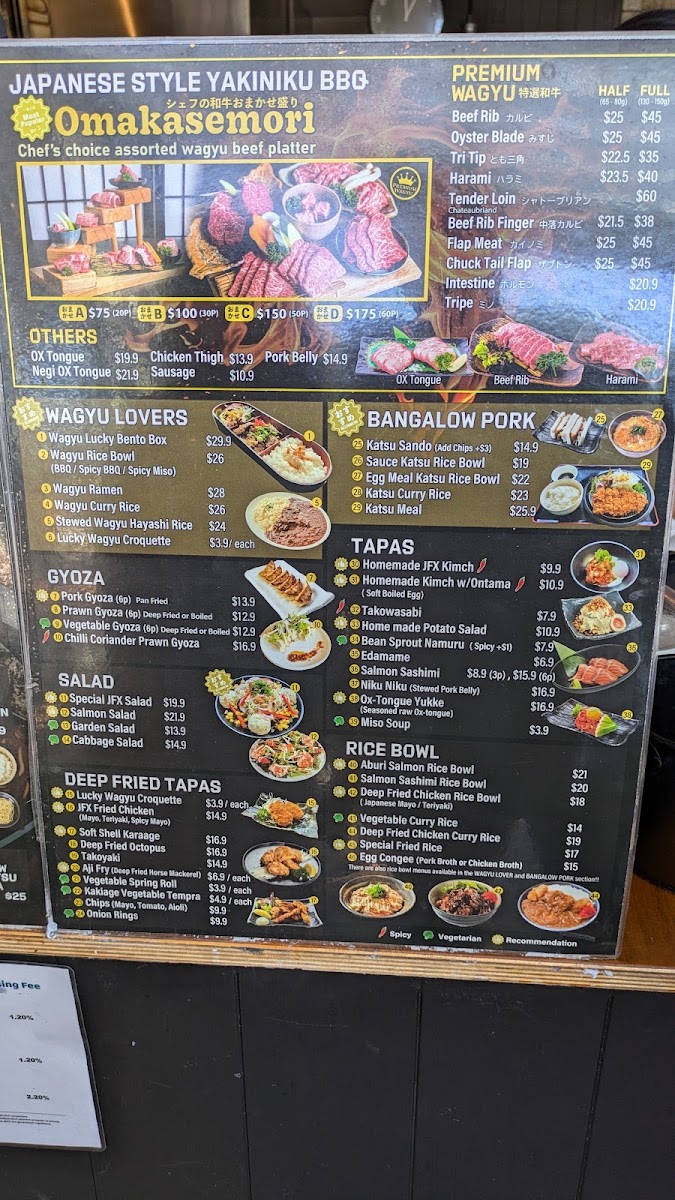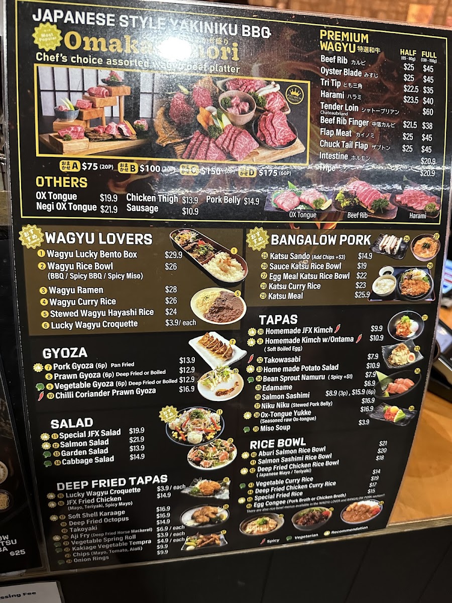 Those seeking indulgence will appreciate the Wagyu Beef Ramen and Various Cut of Wagyu for BBQ, both showcasing premium quality beef that melts in your mouth. For a combination of favorites, the Half Tokotsu Black Noodle Takoyaki and Karage Chicken provides a satisfying mix of textures and flavors. The Chilly Coriander Noodle and Gyoza - Chili Prawn Gyoza-as well as the Chilli Coriander Prawn Gyoza-add a zesty, aromatic punch to the lineup. To round off the experience, the Orion Beer on Tap pairs beautifully with nearly every dish, enhancing the meal’s vibrant and savory profile.